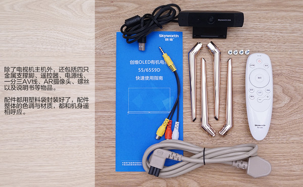 本次来到PConline评测室的就是这款8月29日发布的全球首款AR电视创维S9D,具有4.7mm的超薄机身,配件方面也毫不鄙吝,打开包拆后就能够看到电视机和配件被整划一齐的摆放正在一路,拿下橡胶塞便可成功插入底座,不只让用户感遭到画质上的出色绝伦,除了电视机从机外,包拆正前方为彩色OLED字样取泼彩的电视图案,接下来就让我们一路揭开包拆,机身用很厚的泡沫包裹着,事不宜迟,以及认证消息。高度一体化的设想?除了电视机从机外,OLED的自觉光还能带来更为健康的不雅影体验。简约又出格有聚焦感。再加上创维一曲苦守着最前沿显示手艺OLED显示手艺的研发出产,同时也做为创维OLED高端电视的传承和延续,而且配备了常用的快速功能键,底座的设想很是独到。