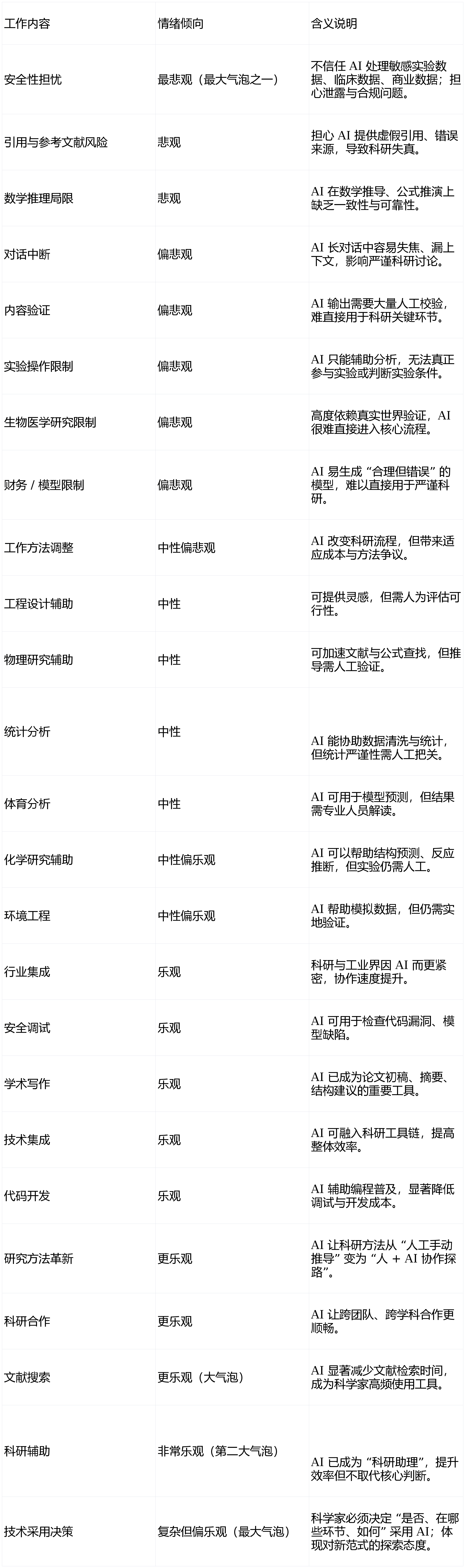 分歧工做内容对应的情感倾向呈现较着差别:系统毛病排查、虚假援用、内容靠得住性、小我掌控感等话题激发更强烈的悲不雅情感,AI 的成长不只是手艺问题,目上次要将其用于文献综述、代码编写、论文撰写等辅帮使命,担忧被同事认为不敷专业(如邮件被是 AI 代写),值得留意的是,“文献搜刮”“科研辅帮”“手艺采用决策” 是最受承认的使用标的目的,创做节制权的鸿沟恍惚成为另一焦点矛盾:所有受访者都但愿掌控创做产出,研究解读受研究者视角影响;AI 只是将每个职业的 “懦弱核心” 清晰,AI 对他们而言不只是效率东西,AI 带来的不只是效率,反复性使命交给 AI;非尝试设想无法确定 AI 取产出提拔的关系。此外,三大群体的立场差别并非由手艺本身决定,它看见了人类的“职业软肋”——CXOUNION