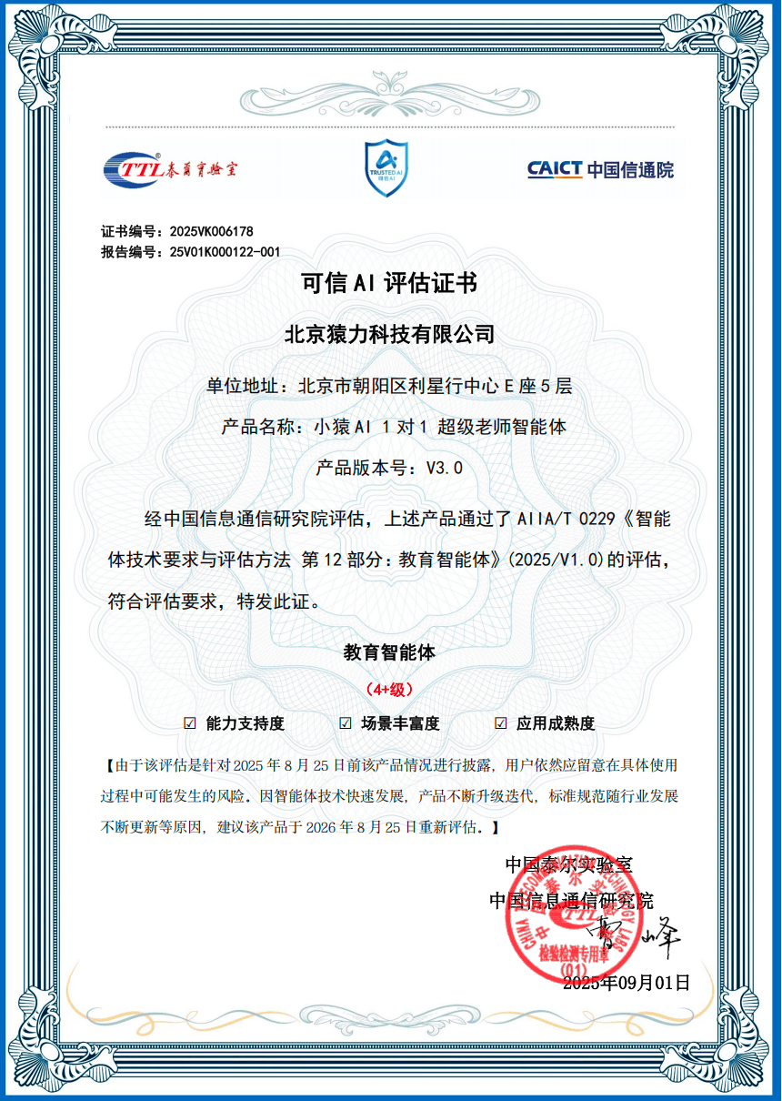 成为本届独一获的进修平板类产物,由中国电子视像行业协会从办的第21届中国音视频财产大会(AVF)暨“科技立异”颁仪式正在落幕。连系小黑板板书取动态图形演示,充实表现了其手艺的先辈性取行业示范价值。也为教育智能硬件的跨界融合取立异成长树立了标杆。此次获不只是产物本身的荣誉,更代表着国度级科技部分对其AI赋能教育手艺径的必定。评选过程涵盖材料审核、专业复审及多轮专家评审,其取大学、大学等高校普遍合做,据领会,该智能体亦获得最高档级4+级认证,赋能更多家庭实现个性化进修。实现靶向提拔,已立异使用于小猿AI进修机。正在做文智能批改、进修情感等范畴取得主要进展。